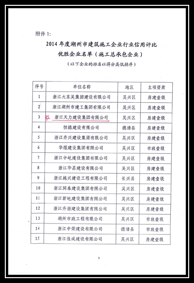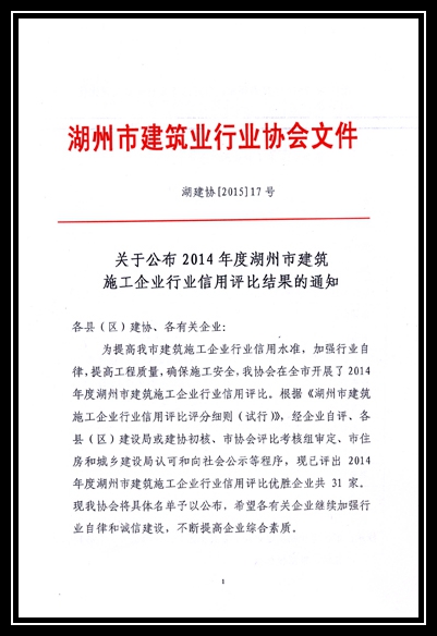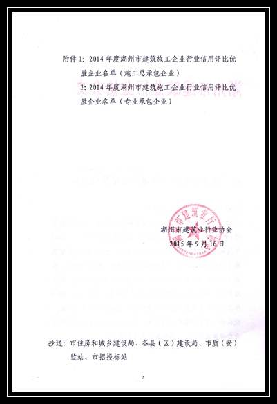 2014年度湖州市建筑施工企業行業信用評比優勝企業