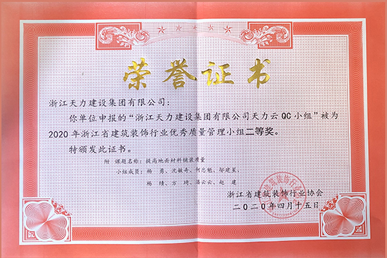 天力云QC小組被評為2020年浙江省建筑裝飾行業優秀質量管理小組二等獎